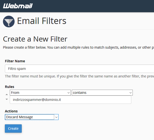 Assegnare un nome al proprio filtro (nell’esempio “Filtro spam”), specificare le regole per il filtro (ad es. “il mittente contiene….”, “l’oggetto contiene…”) e l’azione da eseguire (“discard” per cestinare il messaggio automaticamente):