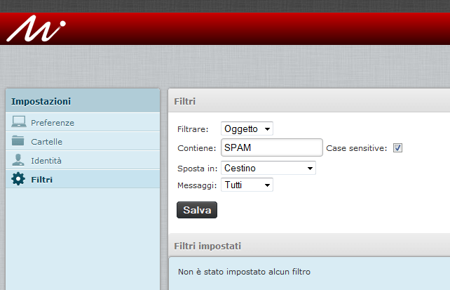 per creare un filtro che sposti automaticamente i messaggi in cartelle specifiche è possibile intervenire sul menu della nostra webmail: